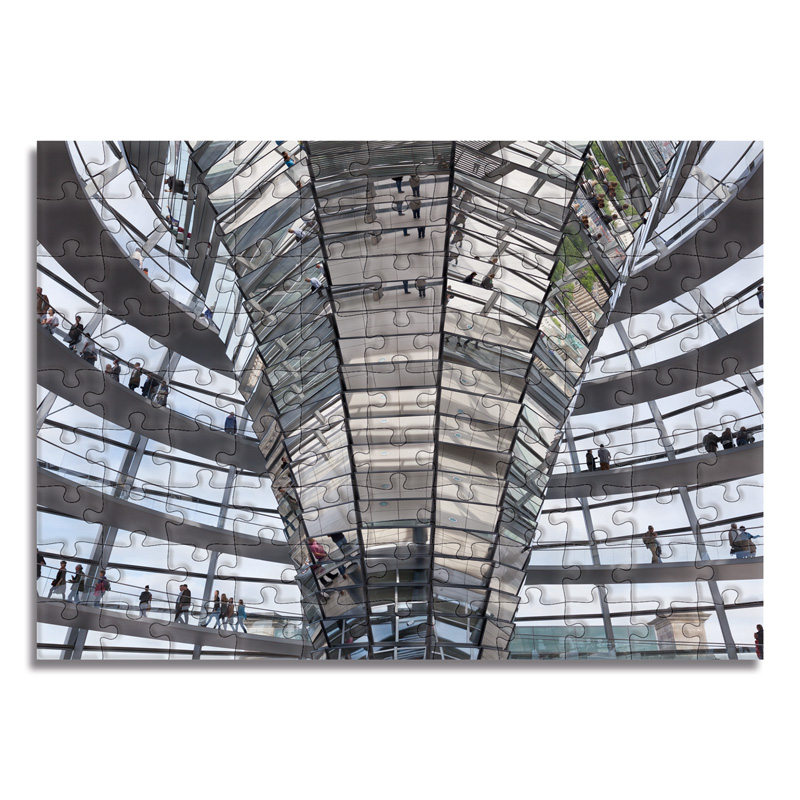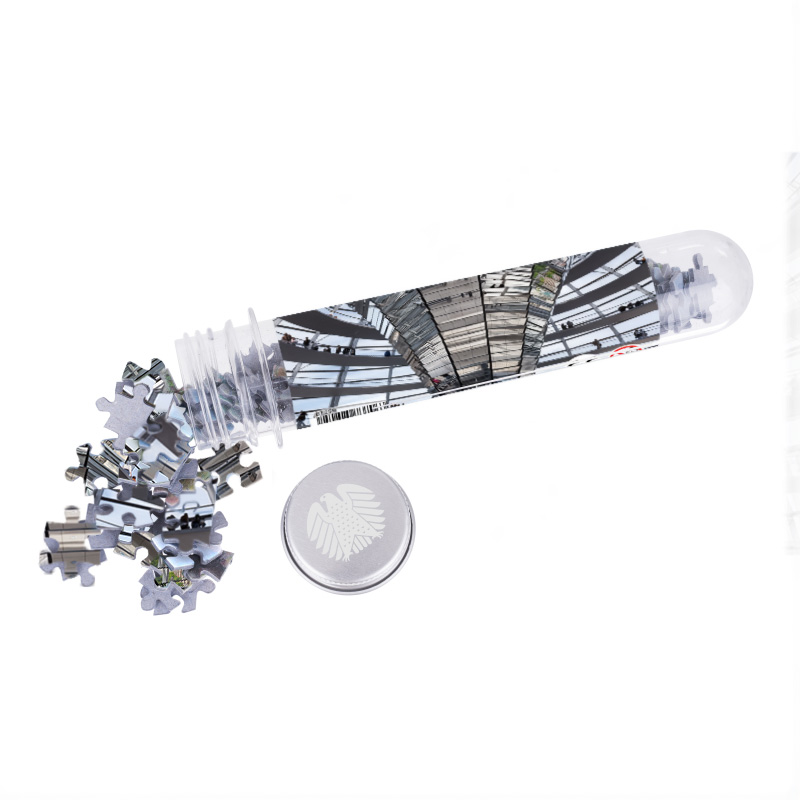 Sticker mit Bildangaben auf der Seite, Gravur mit dem Bundestagsadler auf dem Deckel.